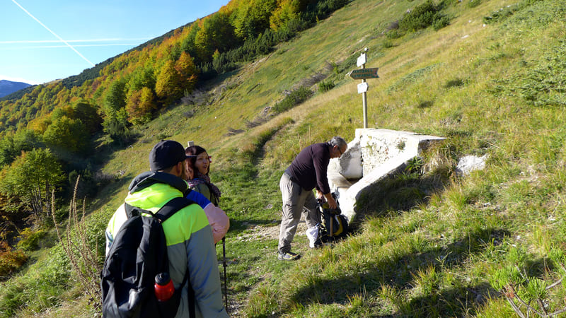 Desde el Rifugio «Di Marco» cruzamos el Prato della Maiella (hasta 1840 m s.n.m.) y llegamos al SP, desde donde iniciamos el descenso hacia el valle de Guardiagrele, pasando por Fonte Carlese, il Campanaro y Valle delle Monache. Desde aquí, todavía cuesta abajo, llegamos a Piana delle Mele, bordeamos la cabaña del Poeta y llegamos a Bocca di Valle, donde se encuentra el monumento a Andrea Bafile. Atravesando el barrio de Comino y bordeando la iglesia de San Donato, llegamos a Guardiagrele (deja la llave del refugio en la sede del Parque Maiella, en Via Occidentale).