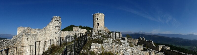 El castillo de Bominaco, situado en una posición dominante sobre el complejo benedictino que hay debajo y la llanura de Navelli, data del siglo XII, pero su conformación actual es fruto de la reconstrucción tras su destrucción en 1424 por las tropas de Braccio da Montone, durante la disputa por la sucesión al trono de Nápoles entre Alfonso de Aragón y Luis III de Anjou. De forma trapezoidal con torres de escollera cuadrangulares, tiene en su punto más alto una robusta torre cilíndrica con una sólida escarpa en la base.